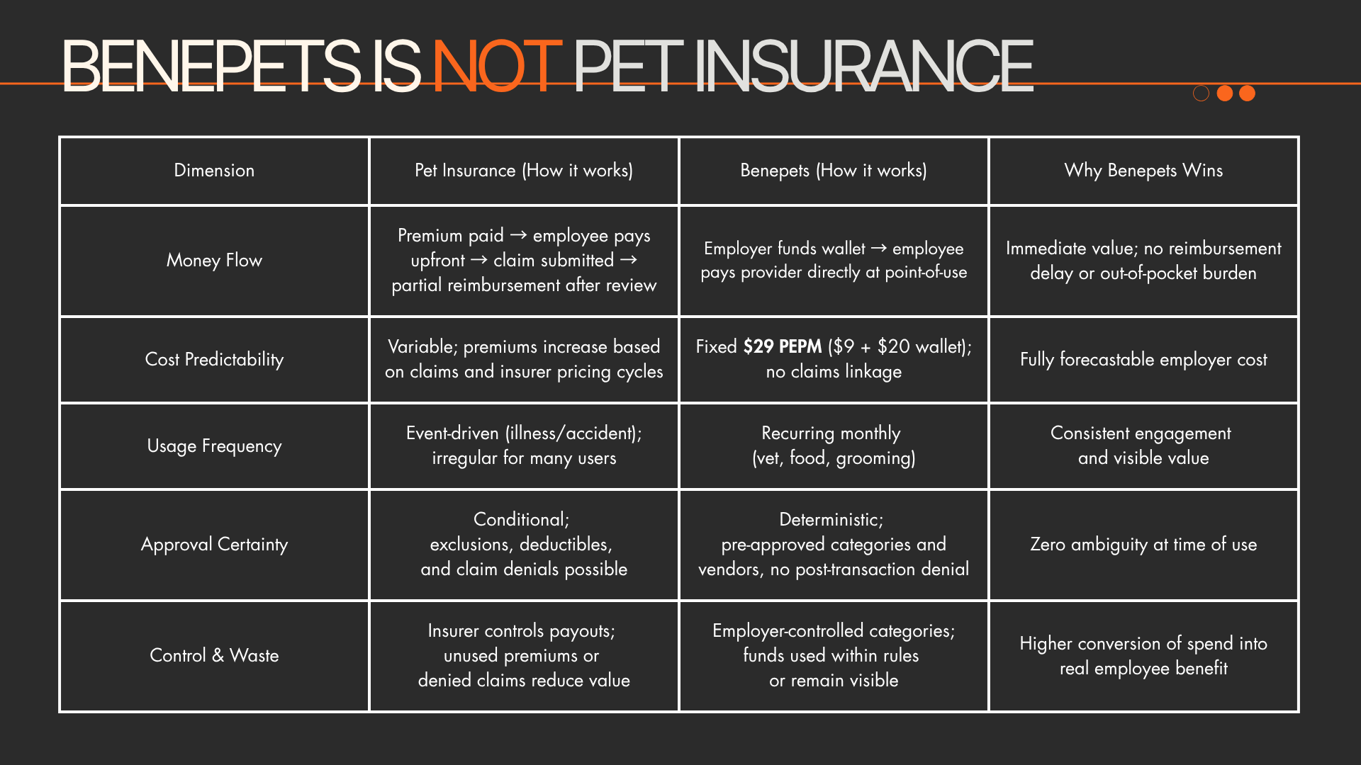 Pain Point: Corporate benefits center on children and spouses. It misses the parallel world sitting right next to it: The pet is a child and pet care mirrors dependent care. There is a mismatch between how employees live and how benefits still assume they live — a blind spot tied to cost, productivity, and retention.